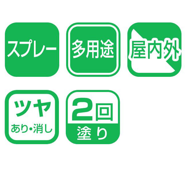標準塗り回数:2回塗り光沢:ツヤあり塗膜の仕上がり:不透明(下地を隠す)規格ラインナップ300ml塗り面積(平方メートル)【一般色 2回塗り】300ml:0.6〜1.2(タタミ0.4〜0.7枚分)【金・銀】300ml:1〜1.3塗料タイプシリコン変性アクリルラッカー(ゴールド、銀はアクリル樹脂塗料)アクリルラッカーにシリコン成分を付与した塗料。