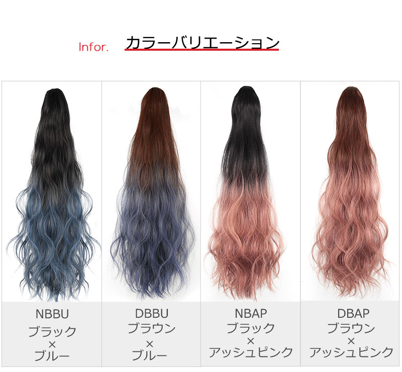 商品詳細 素材 新型耐熱繊維(180℃まで) 装着方法 クリップ式 カラー NBBU ブラック×ブルー DBBU ブラウン×ブルー NBAP ブラック×アッシュピンク DBAP ブラウン×アッシュピンク 髪の長さ 約53cm (+−3cm) 重さ 約125g